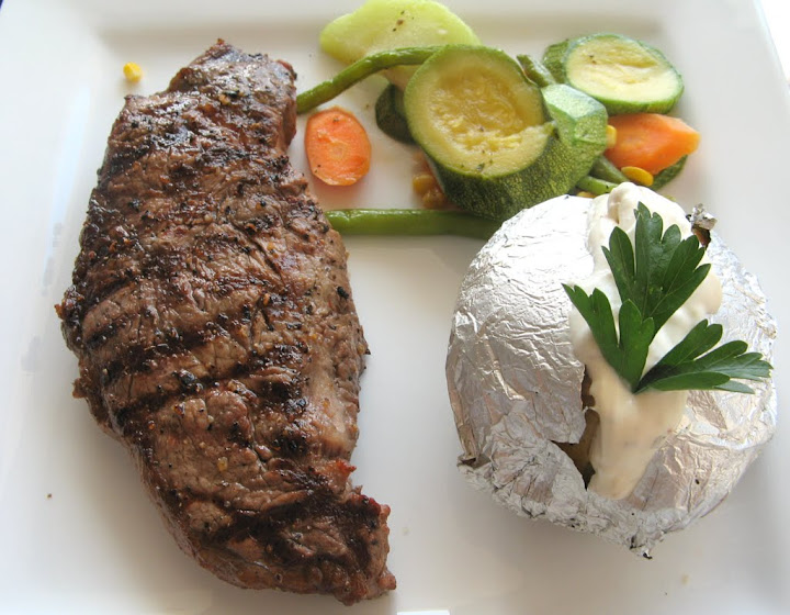 | Bife de Chorizo. Tasty vegetables. Foiled baked potato |