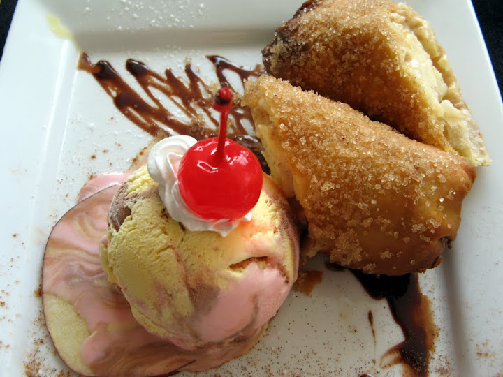 To finish, two of us ordered dessert. Jennifer had the apple strudel, chocked full of raisins and scented with cinnamon, flanked by a scoop of colorful ice cream. I had a somewhat similar dessert in which chunks of apple were baked in a crisp pastry roll and bound by cream cheese. It also was accompanied with very good ice cream. My dessert completely exceeded my expectations.