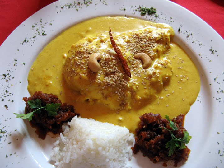 Just for something totally different and unlike my usual preferences, I chose Pollo Hindú. It was a large, tender, boneless chicken breast in a very mild, curry flavored cream sauce. The sauce had ground cashews in it, which added little to the whole. Overall, the dish was nice, but unexciting. The home made chutney on the sides was a very nice touch. Note: I set the little dried chile aside.
