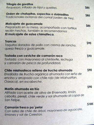 I chose Marlín En Frío and our amiga, Luz Ma, had Chile Mihuateco Relleno de Trucha Ahumada. Doña Cuevas skipped the appetizers, but had a Sopa de Frijoles en Caldo de Ayocote for her next course, as did Luz Ma.