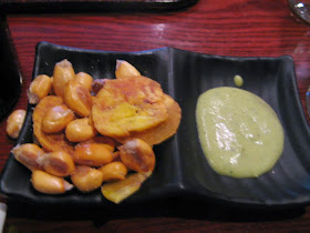 Our waiter was a fun sort of guy, good at advising us as to the options. One of our favorite parts of a restaurant meal is choosing and eating appetizers. We started with these crisp peanut, corn nuts and banana chip nibbles along with a zippy, creamy jalapeño based dipping sauce. (This was the spiciest thing in our meal.)
